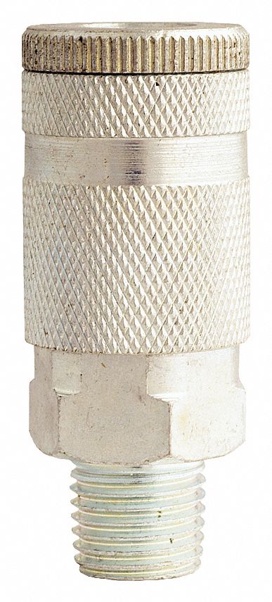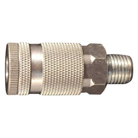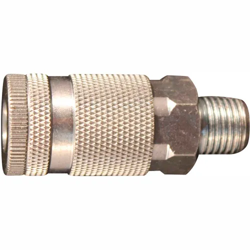 1/4" MNPT D Style Coupler. Features: 1/4" male national pipe thread Maximum inlet pressure of 300 pounds per square inch Air flow of 34 standard cubic feet per minute Maximum temperature of 250 degrees Fahrenheit 1/4" MNPT D style coupler has a 1/4" basic flow size and is steel plated to resist rust. Has a maximum inlet pressure of 300 PSI and air flow of 34 SCFM. Complete with a Buna-N seal. D style couplers and plugs are ideal for automotive application.