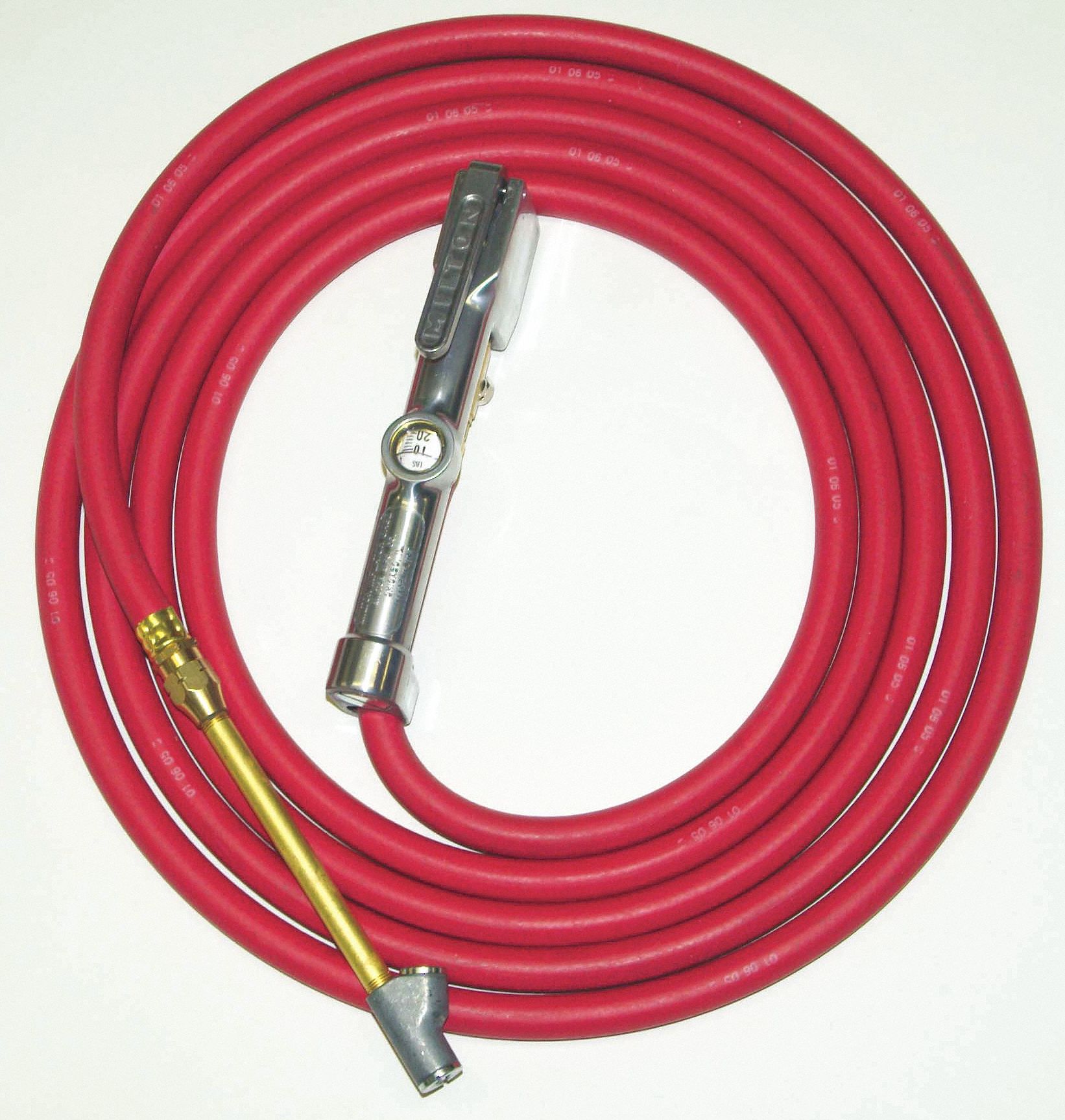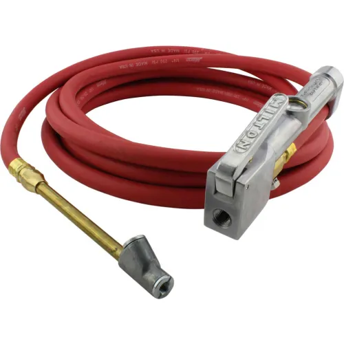 This dual head straight foot chuck inflator gage is made with heavy duty construction and magnifying window lens. At 15 feet in length, this tire inflator gage offers a full swivel chuck and is compliant. Reading in both PSI and kPa, the pressure range for this inflator gage is 10-160 PSI or 80-840 kPa. Features 10 to 160 pounds per square inch or 80 to 840 kilopascal 3/8 - 24 threads Full swivel dual head 15' hose length