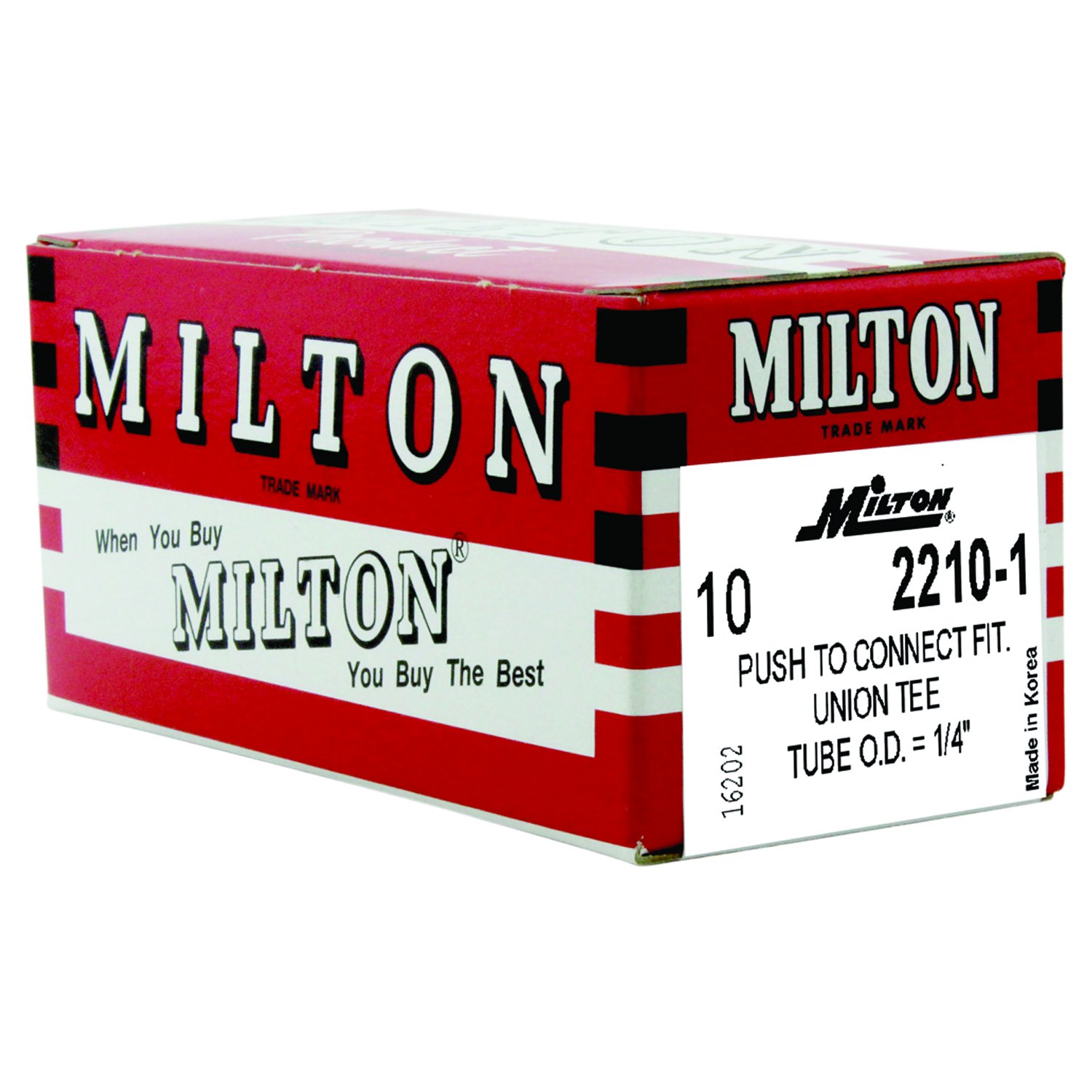 Tee union nylon push to connect tube fittings offer easy installation of air lines by simply pushing tubing into fitting, no gluing or special tools required. These reusable push to connect fittings have a 1/4" OD and allow maximum air flow and faster connection than standard compression fittings. Milton nylon push to connect tube fittings are designed for use with nylon, polyurethane, or low and high density polyethylene tubing. Reusable by simply pushing sleeve in and release the tubing. Great for garage or shop, tee fittings pivot 360 degrees Fahrenheit or ease of installation.
