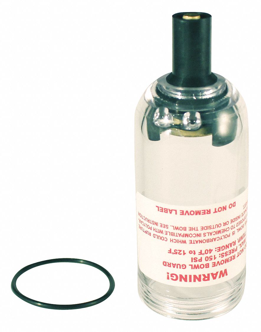 Replacement polycarbonate bowl for mini filter or lubricator has a 1 ounce capacity and is for use with Milton mini filters and regulators. Unthread bowl by turning counter clockwise Always check bowl for cracks or defects 1 ounce bowl capacity