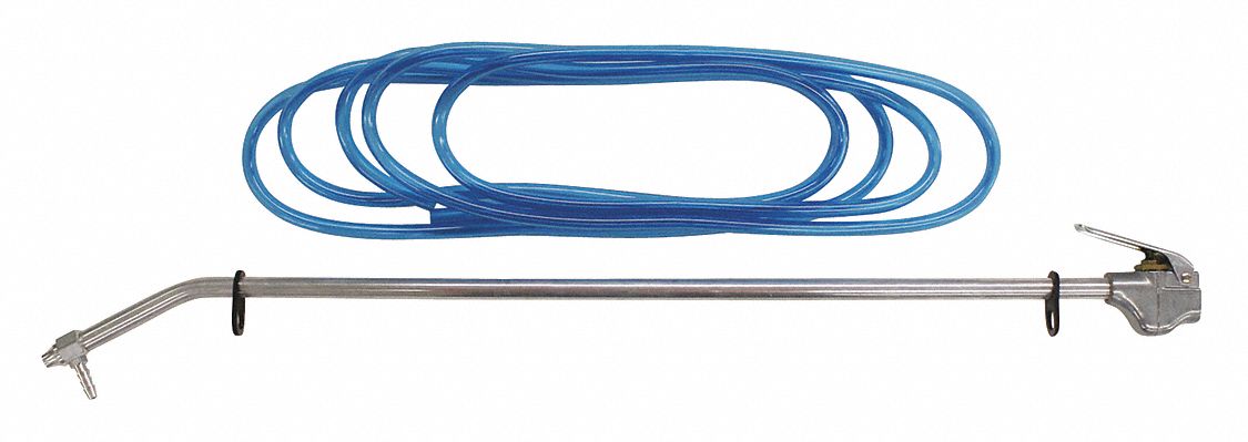 With its 4' angled extension, this siphon spray blow gun is perfect for degreasing engines, shop floors, spraying livestock or plants and other liquid applications. This blow gun set comes with 15' of tubing and offers a maximum working pressure of 150 PSI. Blow gun comes with 1/4" NPT air inlet and offers 11.3 SCFM at 100 PSI. 1/4" national pipe thread Maximum working pressure of 150 pounds per square inch Designed for use with liquids