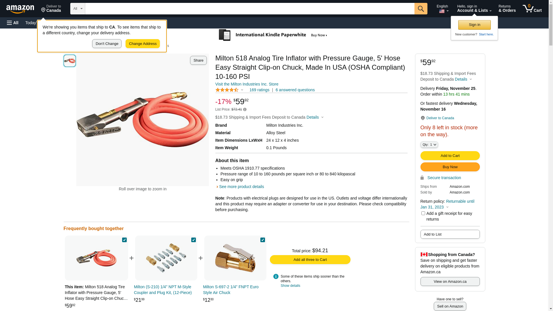 Milton 518 Analog Tire Inflator with Pressure Gauge, 5' Hose Easy Straight Clip-on Chuck, Made In USA (OSHA Compliant) 10-160 PSI