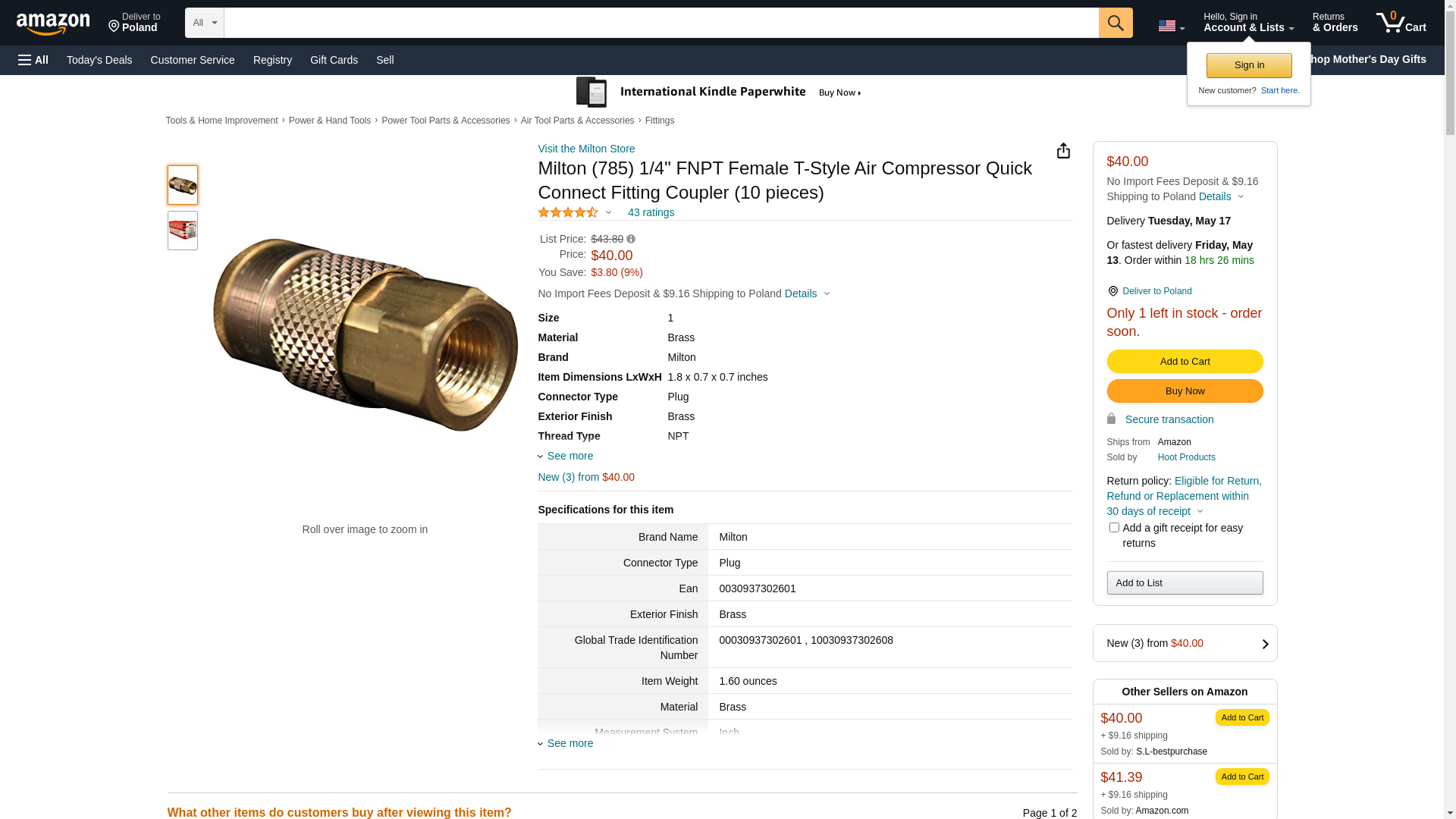 Milton 1/4" FNPT T Style Coupler 785. ✅Milton authorized distributor ✅. ☎ (800) 884-5767 Mon-Fri 8:00 AM - 5:00 PM ET or order online 24/7