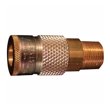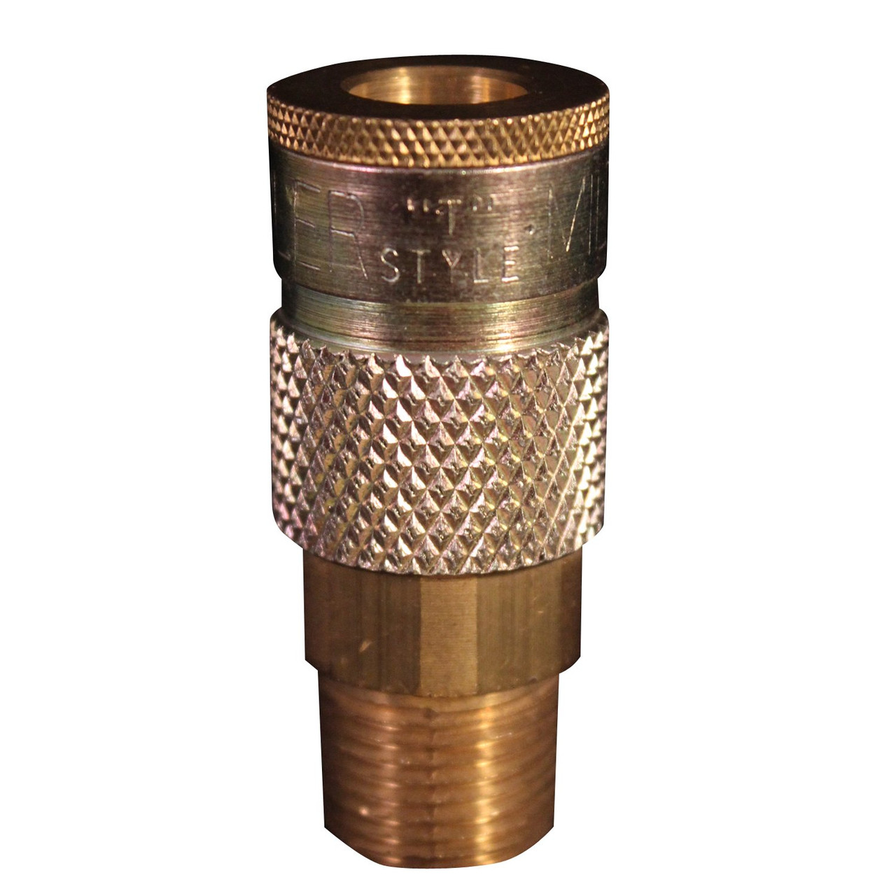 3/8" MNPT T Style Coupler. Features: 3/8" male national pipe thread Maximum of 300 pounds per square inch Air flow of 40 standard cubic feet per minute Maximum temperature of 250 degrees Fahrenheit Buna-N seal 3/8" MNPT T style couplers offer a maximum inlet pressure of 300 PSI and are ideal for industrial application. These brass couplers have air flow of up to 40 SCFM and are complete with a Buna-N seal.