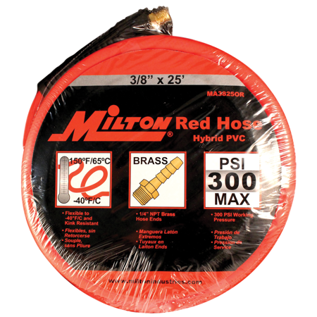Milton Cobra Flex Hose MA3825OR, Most Flexible Hose Available, Quality Solid Brass Hose Fittings, Resists Kinking, 25 Foot Hybrid PVC Air Hose, 300 PSI Max Pressure, 3/8" Hose ID, 1/4" NPT