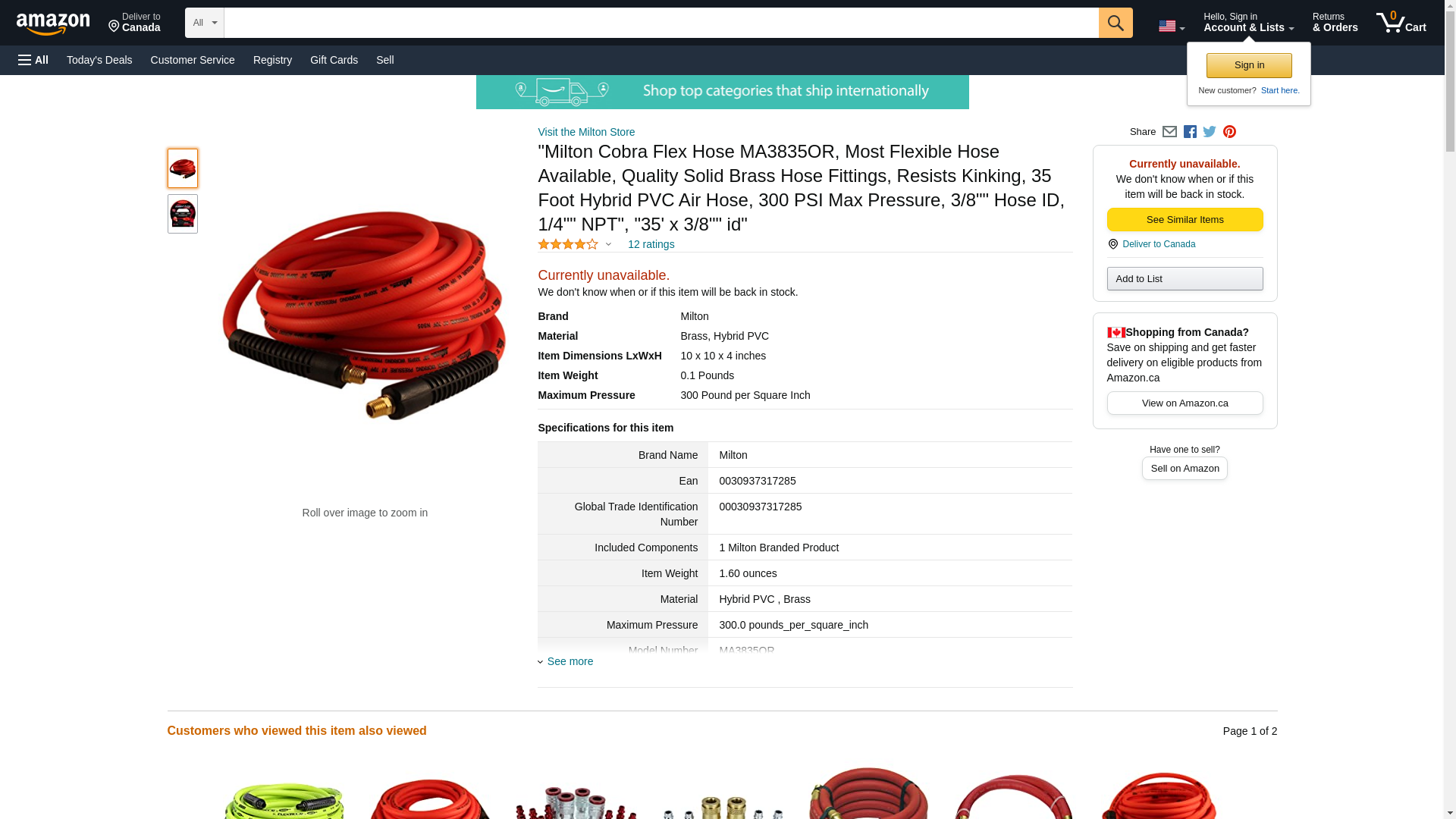 Milton Cobra Flex Hose MA3835OR, Most Flexible Hose Available, Quality Solid Brass Hose Fittings, Resists Kinking, 35 Foot Hybrid PVC Air Hose, 300 PSI Max Pressure, 3/8"" Hose ID, 1/4"" NPT", "35' x 3/8"" id"