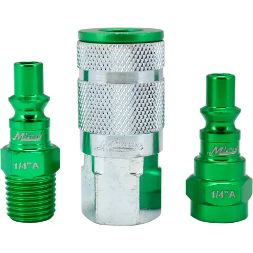 A style colorfit set is color code system that allows for easy matching of couplers and plugs among the standard industrial pneumatic air coupler quick connects Great way to solve that annoying problem of potential crossing contaminating different air lines By dedicating certain colors to different air lines this will eliminate the risk of mixing a lubricated line with a dry air line which will help prolong applications and quickly finishing any project Each piece coated with anodized green aluminum and heavy duty steel sleeves to prevent scratches or dulling of the coupler and plug after uses Features. Durable and high scratch resistant anodized green aluminum. Steel sleeve provides superior durability unlike traditional aluminum sleeves. Allows matching of couplers for dedicated hose applications. Easy to push to connect air compressor accessories. 3 pieceSpecifications. Color Green. NPT Size 025 in