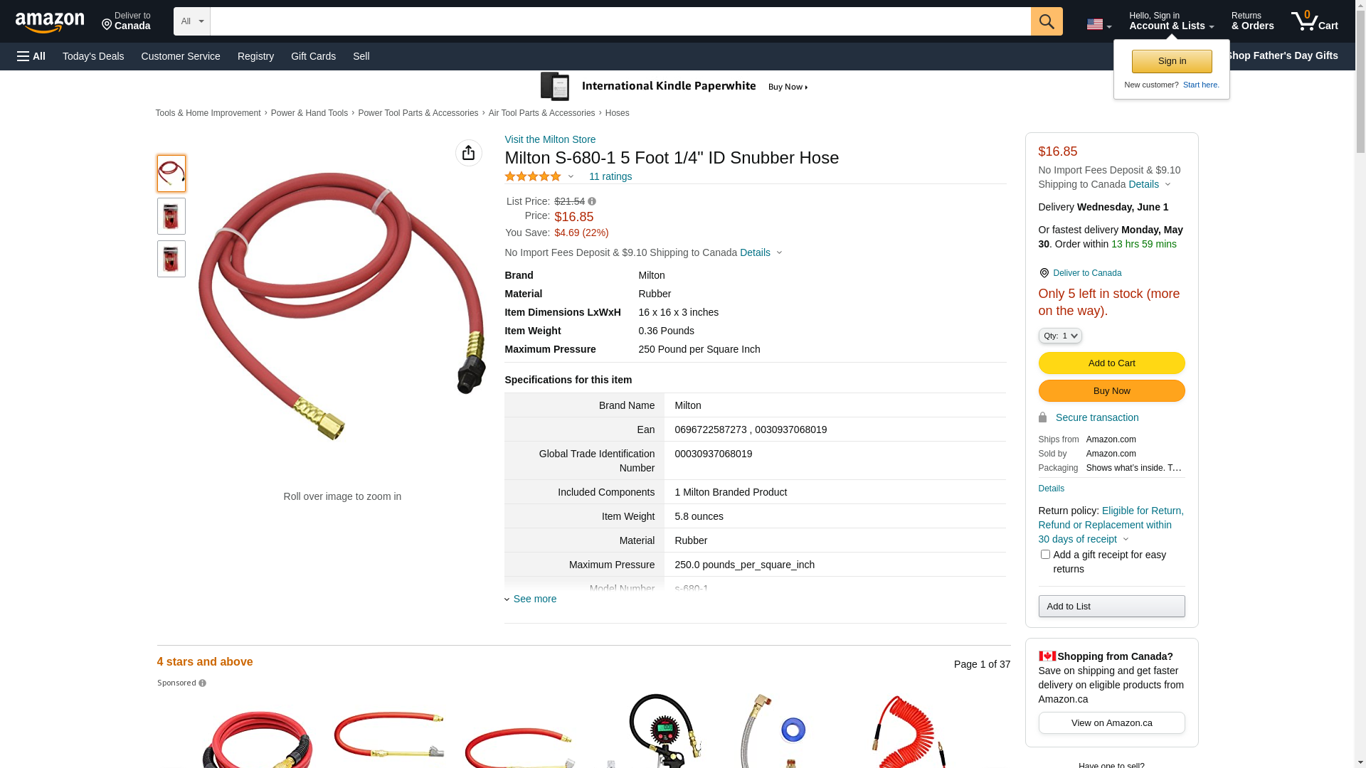 Milton S-680-1 5 Foot 1/4" ID Snubber Hose