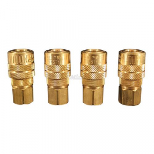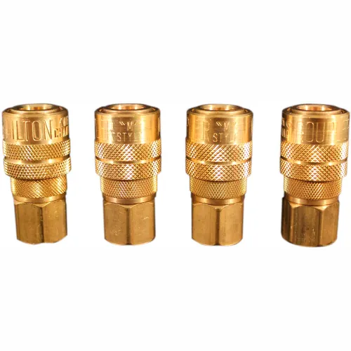 1/4 Inch FNPT M Style Coupler, Pack of Four 1/4 Inch Kwik Style Kwik Change Couplers will interchange with all manufacturers that meet the dimensional requirements of Military Specification MIL-C-4109. M-Style couplers have a basic 1/4" flow size and offer up to 300 PSI. Complete with a Buna-N seal. These M-Style couplers have a brass airflow sleeve and body 40 SCFM. Features 1/4" female national pipe thread. 300 lbs. per square inch maximum pressure. 40 standard cubic feet per minute air flow. 250 degrees Fahrenheit maximum temperature. Buna-seal. N. Meets military specifications MIL-C-4109