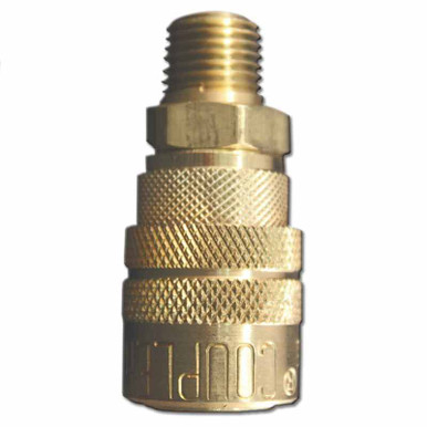Milton Air Coupler, Male 1/4 Inch NPT Male M-Style Coupler Bodies Are Brass With Brass Sleeves M-Style Plugs Are Case Hardened Steel Plated To Resist Rust Maximum Inlet Pressure: 300 PSI Maximum Temperature: 250 Degrees F Air Flow: 40 SCFM Seals: Buna-N