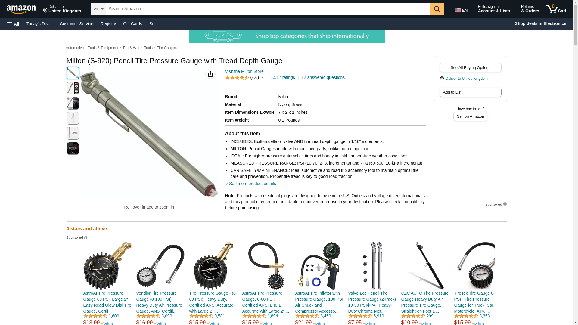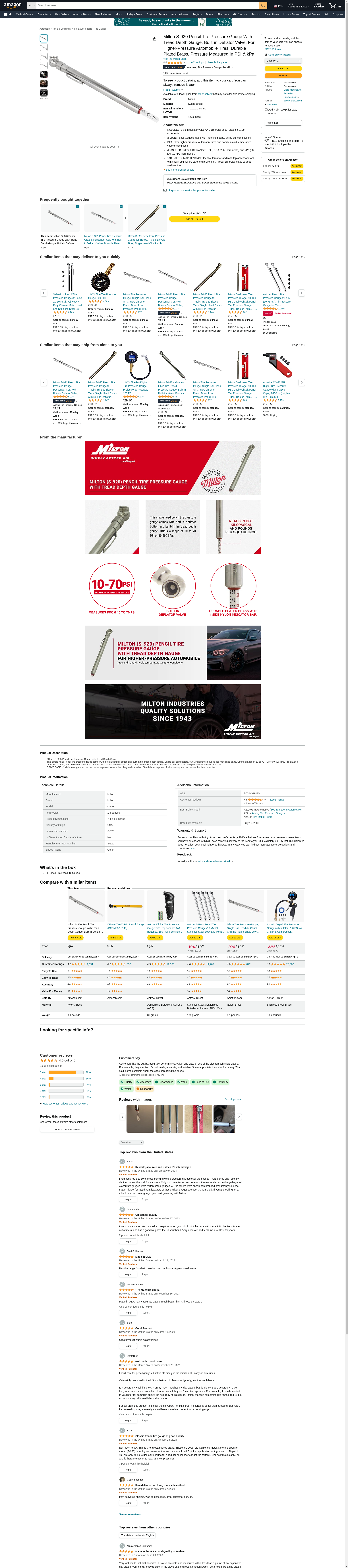 Milton S-920 Pencil Tire Pressure Gauge With Tread Depth Gauge, Built-in Deflator Valve, For Higher-Pressure Automobile Tires, Durable Plated Brass, Pressure Measured In PSI & kPa