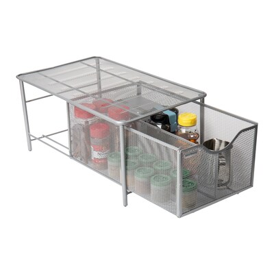 Mind Reader Storage Basket w/ Sliding Drawer and Steel Mesh Platform On Top, Silver (CABASKDR-SIL) | Quill.com