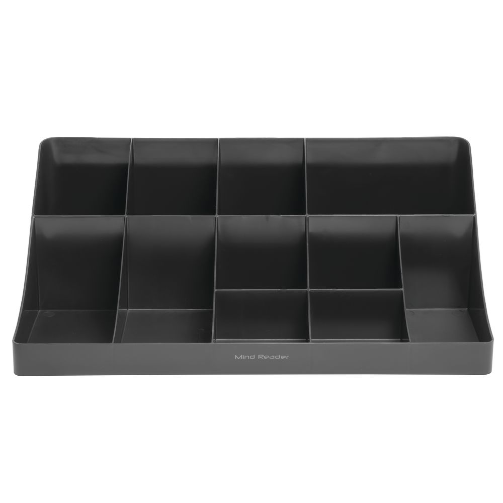 Organize your break room with the Mind Reader Pioneer Breakroom Coffee Condiment Organizer. This durable plastic tray can be placed next to your coffee maker as a convenient place to stow cups, creamers, sweeteners, tea bags, and so much more. With 11 compartments in total, this piece even provides plenty of storage for large offices. Dimensions: 10.4W x 18.75D x9.88H in.. Plastic construction. Classic black in color. 13 compartments. holds all your coffee and tea essentials. Great addition to any break room. Easy to clean. Holds up to 64 cups and lids.