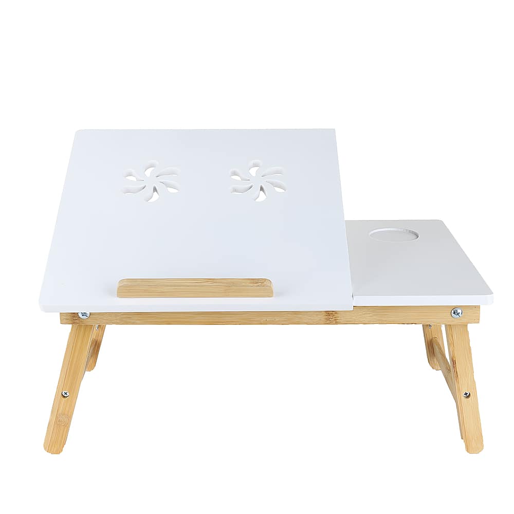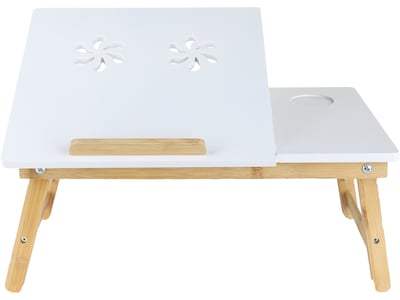 Mind Reader Cooling Laptop Desk Adjustable Bed Tray with Folding Legs, Portable Fliptop Table, Tilting Sections for Work, Reading, Studying, Bamboo, White