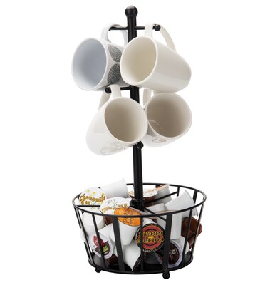 Mind Reader Wire Mesh Countertop Mug Tree with Pegs and Condiment Storage Holder, Black (PTREEBOT-BL | Quill.com