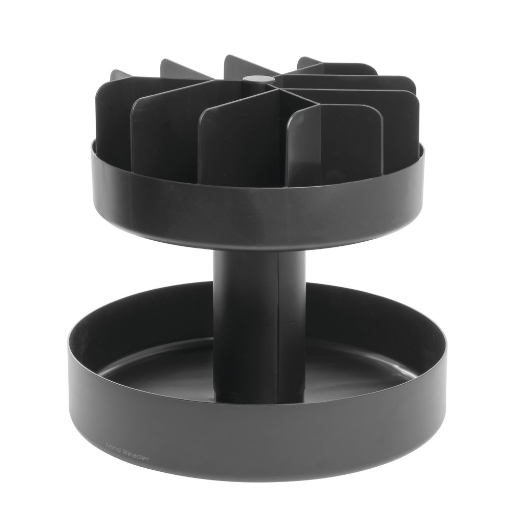 Provide everyone in your office with tasty treats organized within the Mind Reader Supreme 2 Tiered Lazy Suzan Breakroom Snack Organizer. This two-tier lazy Susan spins around, providing easy access to every compartment. This space-saving design is ideal for small break rooms and kitchenettes. Dimensions: 22.05W x 22.05D x16.14H in.. Plastic construction. Classic black in color. Vertical storage to save on counter space. 360-degree display. Holds a variety of snacks. No assembly required.