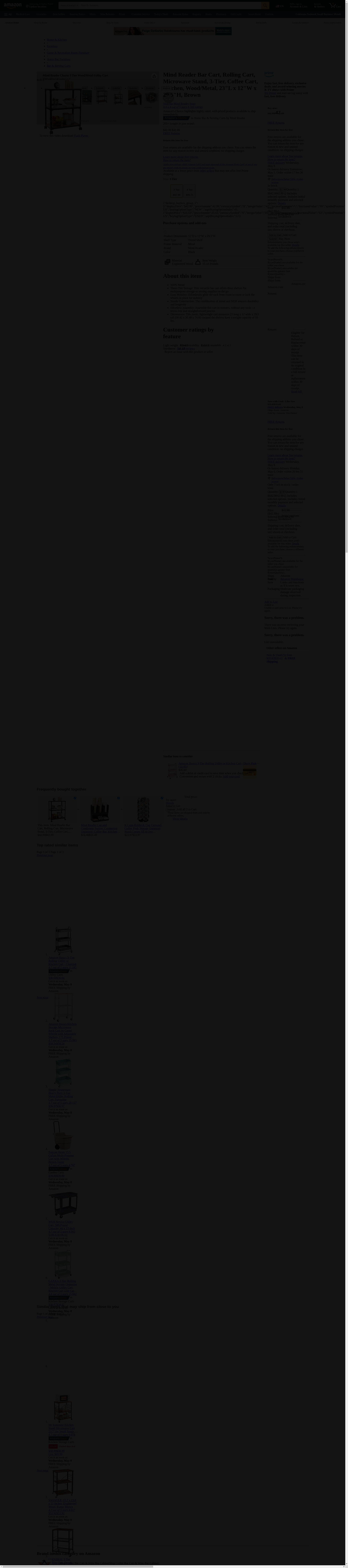 Mind Reader Bar Cart, Rolling Cart, Microwave Stand, 3-Tier, Coffee Cart, Kitchen, Wood/Metal, 23"L x 12"W x 29.5"H, Brown