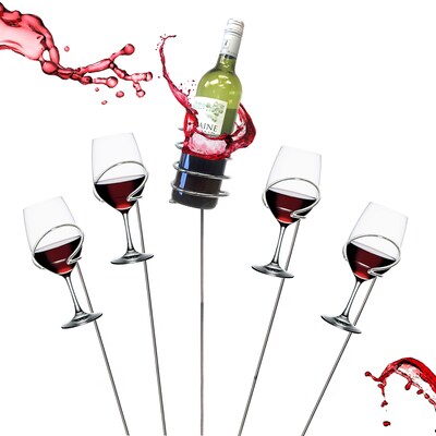 Mind Reader Picnic Wine Glass and Bottle Stakes, Outdoor Dining, Metal, 5 Piece Set, 3.5" L x 3.5" W x 19" H, Silver