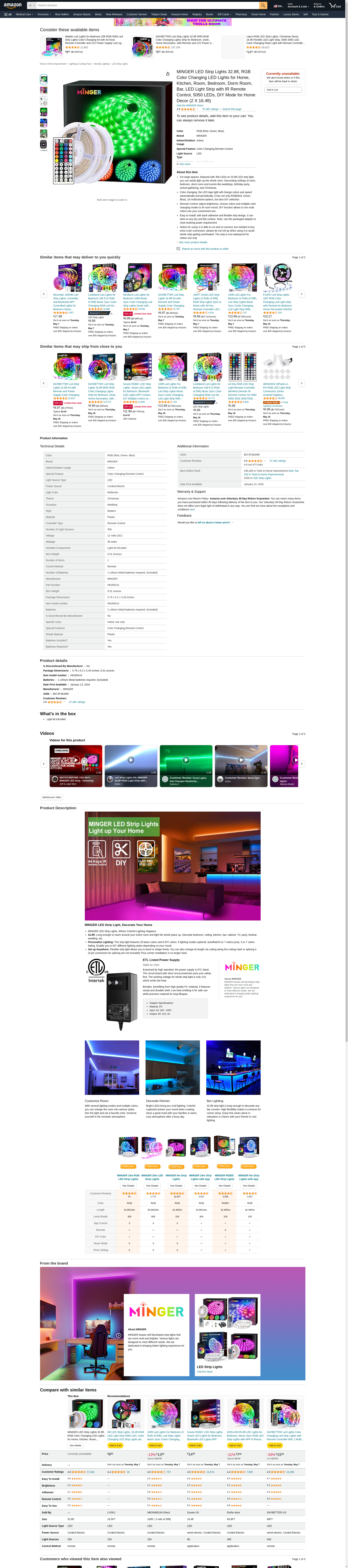 MINGER Led Strip Lights Kit, 32.8Ft RGB Light Strip with Remote, Controller Box and Support Clips for Room, Bedroom, Home, Kitchen Cabinet, Party Decoration 12V/3A Adapter, Non-Waterproof, 2x16.4Ft: Maxedbuy.com