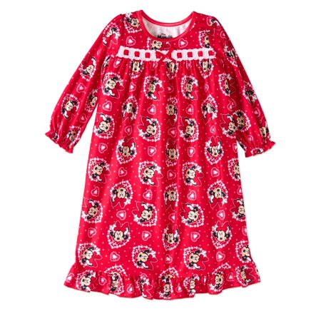 <br /> <b>Minnie Mouse Toddler Girls' Long Sleeve Nightgown:</b> <ul> <li>100% polyester </li> <li>Nightgown </li> <li>Soft jersey fabrication </li> <li>Flame-resistant </li> <li>All-over printed Minnie Mouse pattern </li> <li>Crochet lace and satin detail on front </li> <li>Long puff sleeves </li> <li>Ruffle hem </li> <li>Scoop neckline </li> <li>Tagless inner </li> <li>Officially licensed Disney product </li> <li>Available in assorted styles </li> <li>Wash before wear, turn inside out, machine wash cold, gentle cycle with similar colors, use only non-chlorine bleach when needed, to retain flame resistance use detergent, do not soap, tumble dry low, remove promptly, do not iron</li> </ul>