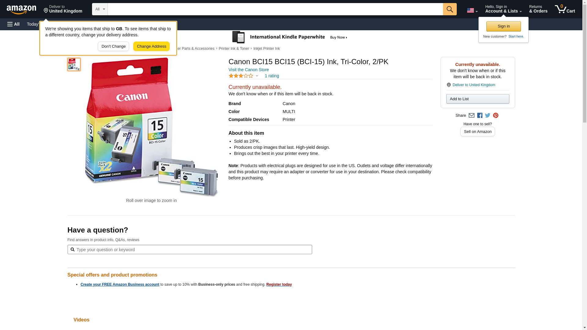 Canon BCI15 BCI15 (BCI-15) Ink, Tri-Color, 2/PK