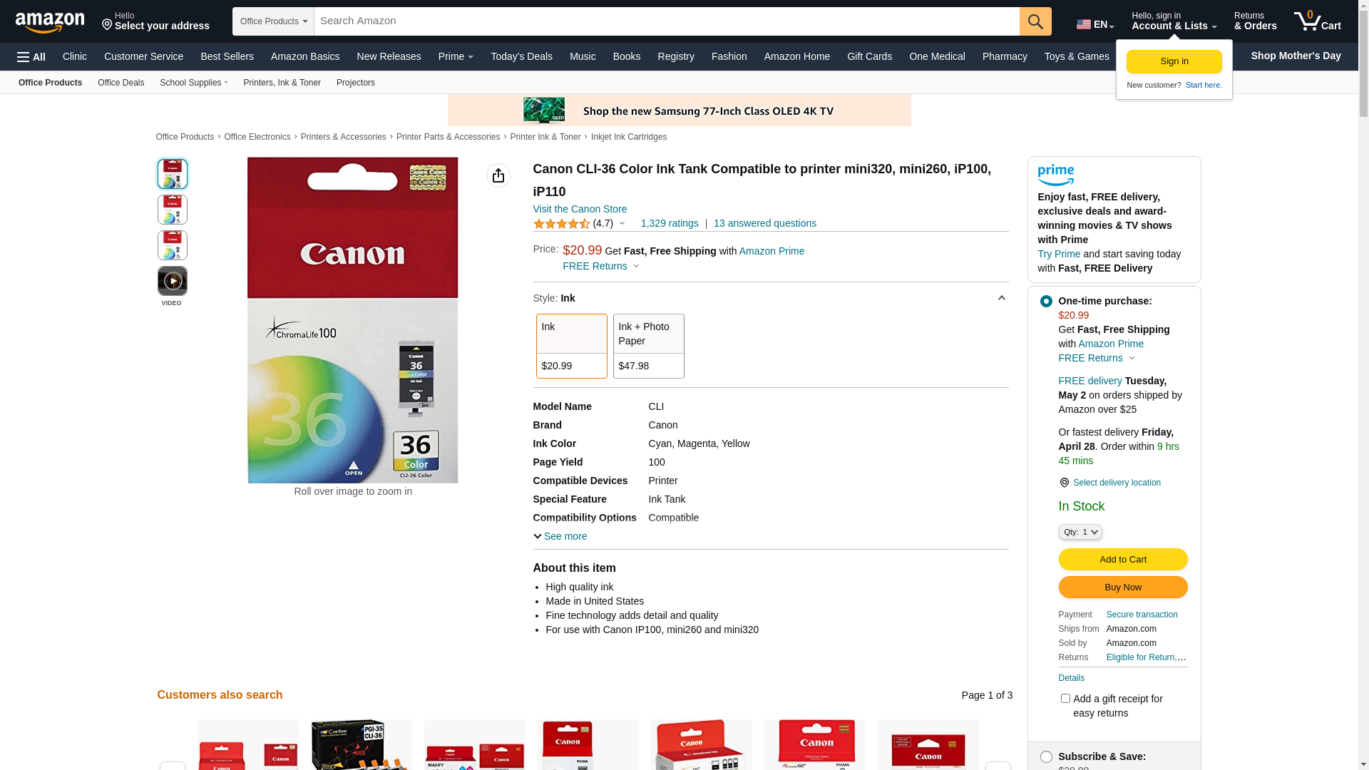 Canon CLI-36 Ink Cartridge, Tri-Color, in Retail Packaging