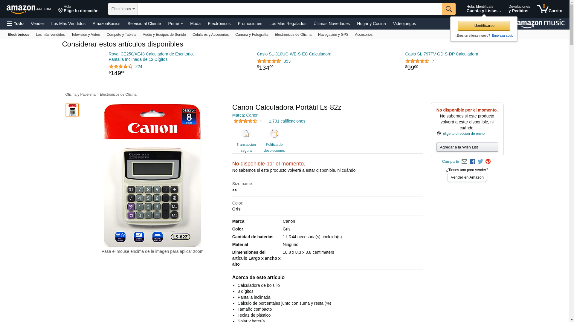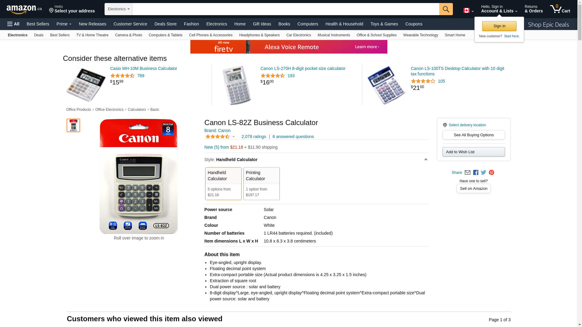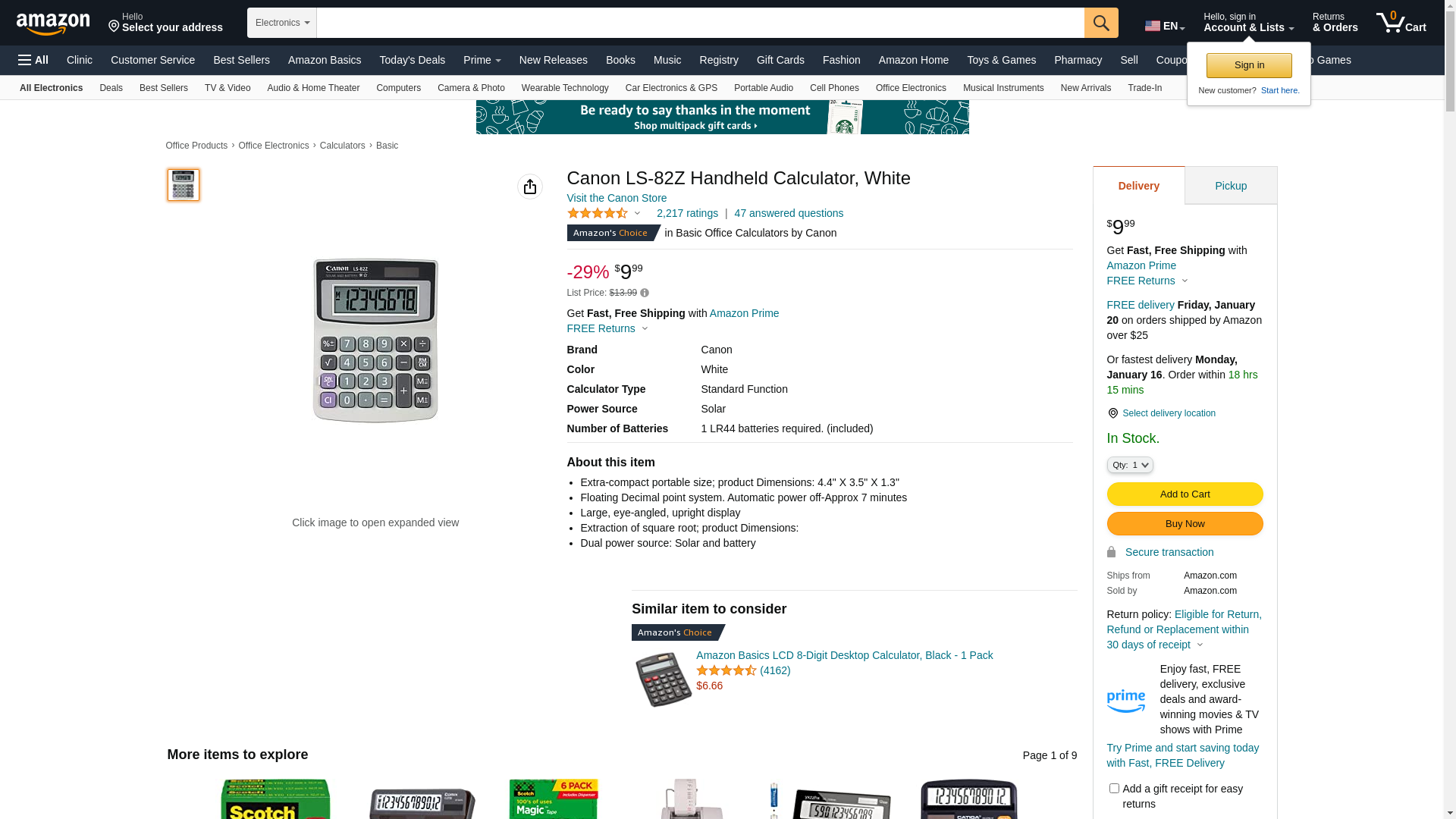 Product Description Thanks to a host of useful features, the LS 82Z is one of the most user friendly calculators around. The upright LCD helps prevent overhead glare and eye strain, while the display makes numbers appear clear and crisp even in the dimmest lighting. Both solar and battery power ensure that you'll always finish whatever you start, whenever and wherever you are so you don't miss a step. Amazon.com Canon's compact LS82Z calculator provides a range of functions for quick calculations and easy figuring of finances. It's an ideal tool for home, office, and school, providing all the basics of calculation: addition, subtraction, multiplication, division, constant multiplication, division and percentage calculations, percentage add-on, and discount calculations. The extra-large LCD display is angled to improve desktop viewing and to reduce glare and eyestrain; the numbers look crisp even in low light. Special function keys and a comfortable keyboard design, with large bold colors, also increase your speed and accuracy. The LS82Z measures approximately 3.5 by 4.5 by 2.25 inches and features an automatic power selection that shifts between solar and battery power as needed.