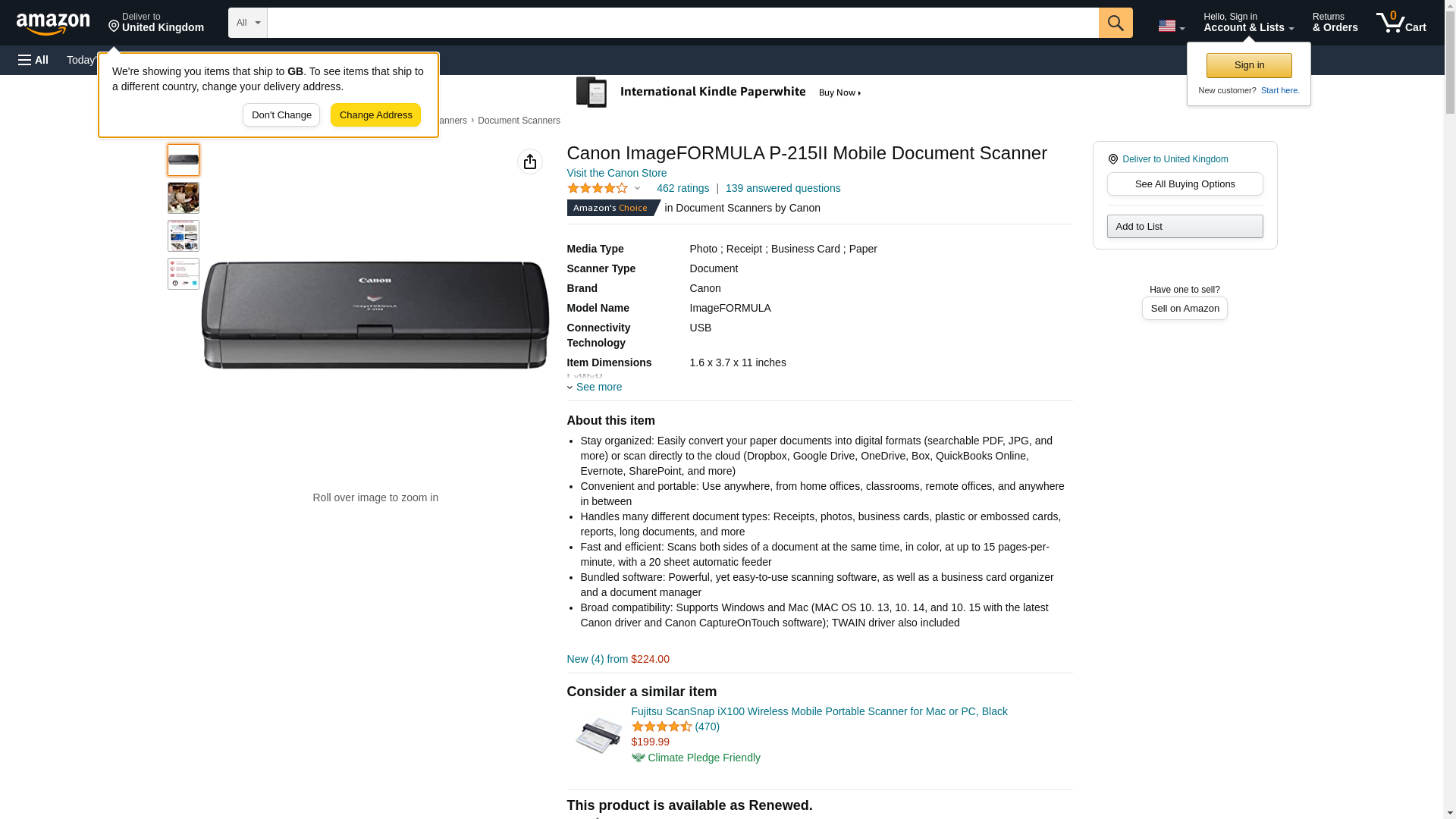 Canon imageFORMULA P-215II Mobile Document Scanner, Black, 1.6" x 11" x 3.7"