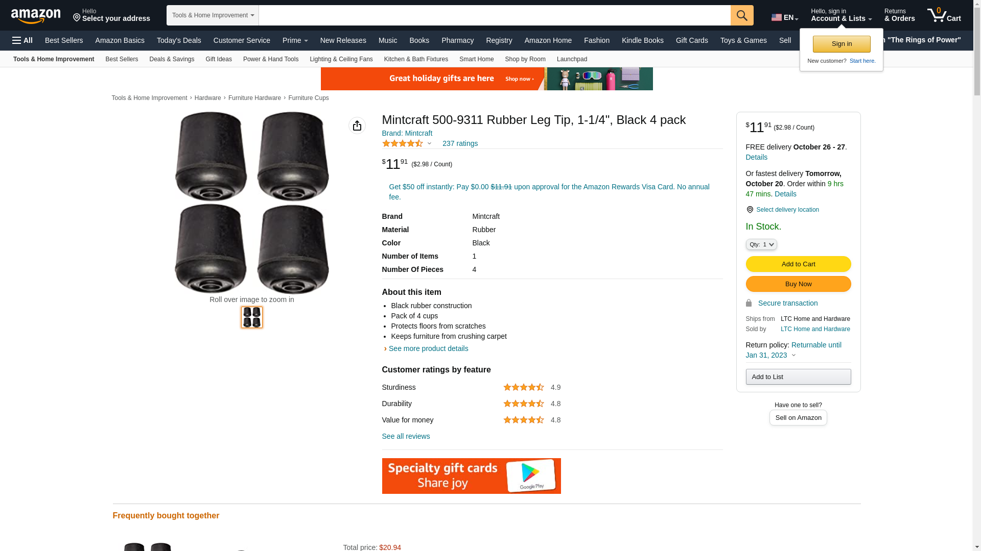 Mintcraft 500-9311 Rubber Leg Tip, 1-1/4", Black 4 pack