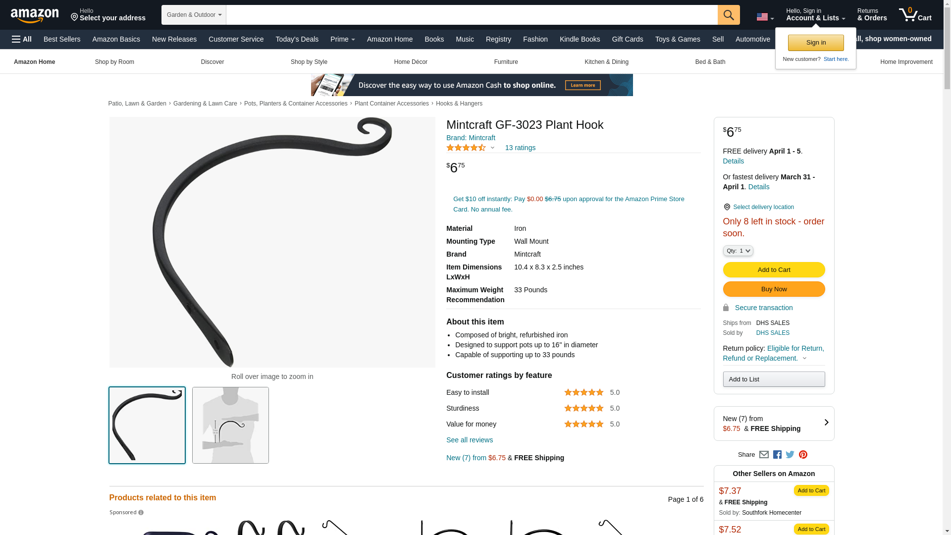 GF-3023 Features: -Wrought iron hanging plant hook. -Matte black powder coated finish. -Weight capacity: 33 lbs. Material: -Metal. Color: -Black. Shape: -Novelty. Material Details: -Iron. Number of Tiers: -1. Capacity: -33 Fluid Ounces. Dimensions: -Holds up to 16" pot. Overall Height - Top to Bottom: -6.27". Overall Width - Side to Side: -0.5". Overall Depth - Front to Back: -8.43". Overall Product Weight: -0.33 lbs.