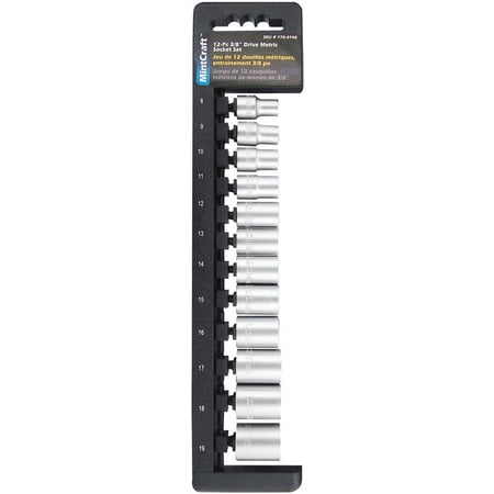 3/8" drive, 12 PT drop forged chrome vanadium steel socket. Size: 8, 9, 10, 11, 12, 13, 14, 15, 16, 17, 18, 19 MM.