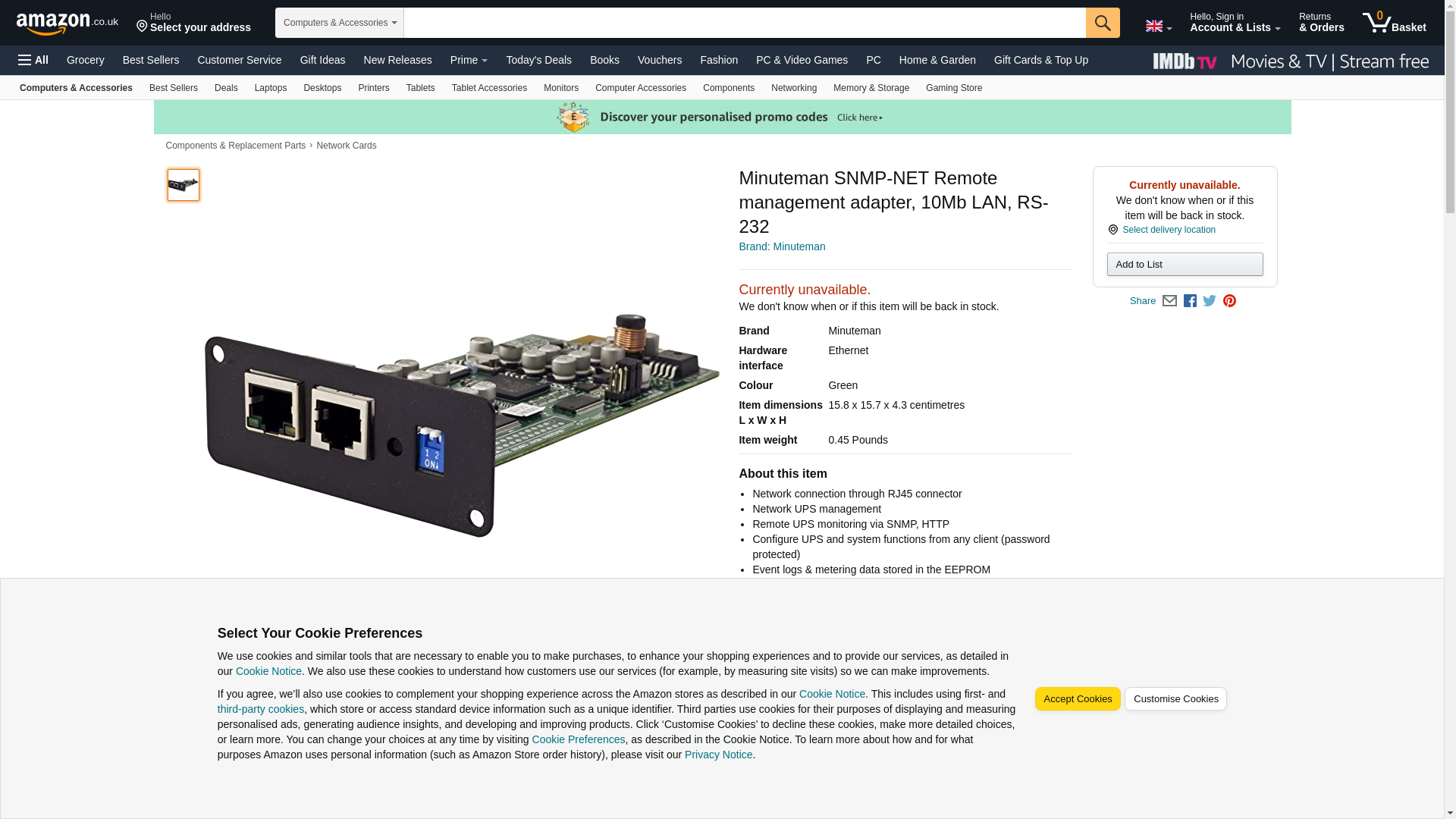 Minuteman SNMP-NET Remote Management Adapter, 10MB LAN, RS-232