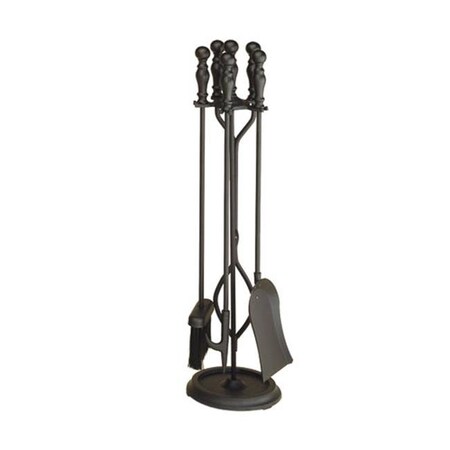 This Black Finish Four Piece Fireplace Tool Set features a round base. The tongs are designed so logs can be easily manipulated. Solid rivets assure that the tongs work smoothly and will not rattle or come apart. All pieces are shipped fully assembled with handles permanently bonded. Features: Tongs designed to easily manipulate logs. Solid rivets assure that the tongs work smoothly and will not rattle or come apart. Cast racks are hand filed during assembly, assuring a smooth fit for tools. Handles designed to fit the hand, each permanently bonded to the rod - will not come loose with use. Tools are sturdy and properly balanced. Brushed made from Tampico - a natural fiber selected for excellent sweeping action, texture and durability. Shovels are solidly riveted and generously proportioned. Balanced with a broad heavy base, designed with enough weight to anchor each tool set which prevents tipping.