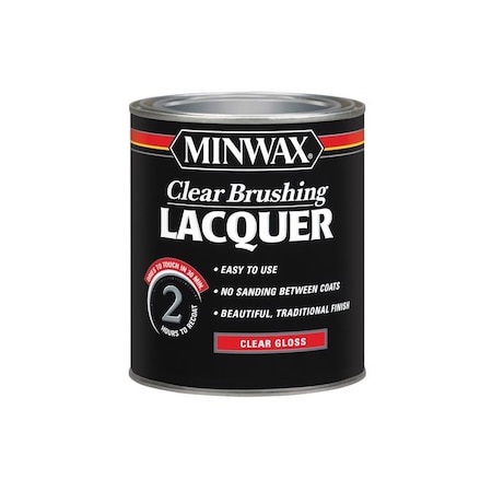 Brand Name: Minwax; Sheen: Gloss; Color: Clear; Finish: Gloss; Product Type: Brushing Lacquer; Container Size: 1 qt.; Transparency: Transparent; Paintable: No; Coverage Area: 125 sq. ft.; Dry Time: 30 min; Indoor or Outdoor: Indoor; Indoor and Outdoor: Indoor