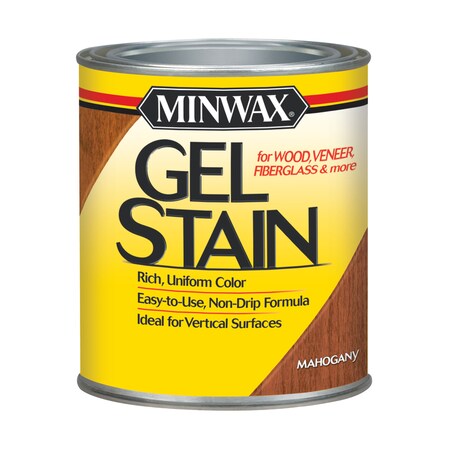 Minwax Gel Stain is a non-drip stain that adds natural colors and accentuates the beauty of a wide range of wood and non-wood surfaces including wood, plywood, veneer, fiberglass, metal and molded fiberboard.; ; Brand Name: Minwax Transparency: Semi-Transparent Color: Mahogany Base Type: Oil-Based Product Type: Gel Stain Container Size: 1 qt Tintable: No Application Method: Brush/Cloth/Foam Time Before Recoating: 6 hr Coverage Area: 200 sq ft UV Resistant: No Sealer: No Indoor or Outdoor: Indoor Color Family: Red Recommended Coats: 1 Dry Time: 24 - 48 hr. Clean-Up: Mineral Spirits