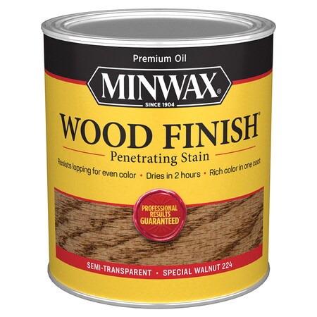 Minwax Wood Finish is a penetrating oil-based wood stain, which provides beautiful rich color that enhances the natural wood grain. It applies easily, absorbs deep into the pores of the wood and is ideal for staining unfinished wood furniture, cabinets, doors, trim, molding, and hardwood floors.; ; Brand Name: Minwax Sub Brand: Wood Finish Transparency: Semi-Transparent Color: Special Walnut Base Type: Oil-Based Product Type: Penetrating Wood Stain Container Size: 1 qt Tintable: No Application Method: Brush, Cloth Time Before Recoating: 4 hr VOC Level: 250 g/L Coverage Area: 150 sq ft UV Resistant: No Sealer: No Indoor or Outdoor: Indoor Color Family: Brown