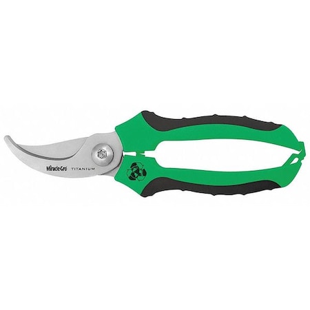 Miracle-Gro Titanium Bonded 8 in. Bypass Pruner features ergonomic grips and an internal spring system for reduced hand fatigue. Titanium Bonded blades are 3x harder than untreated steel and will stay sharper longer. A truly green tool - the handles and grips are made from recycled materials and packaging from post-consumer content. Corrosion and adhesive resistant. Locks for Safety. 1/2 in. cut capacity. Lifetime Warranty. Green/Black handles. Powered by Clauss.