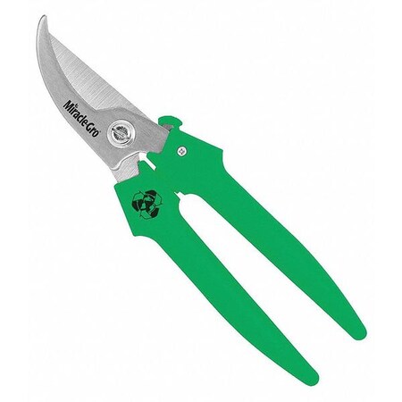 Miracle-Gro Stainless Steel 7.5 in. Bypass Pruner features an action spring and light-weight design for reduced hand fatigue. A truly green tool - the handles are made from recycled materials and packaging from post-consumer content. Oversized stainless steel blades. Locks for safety. 1/4 in. cut capacity. Lifetime Warranty. Green handles. Powered by Clauss.