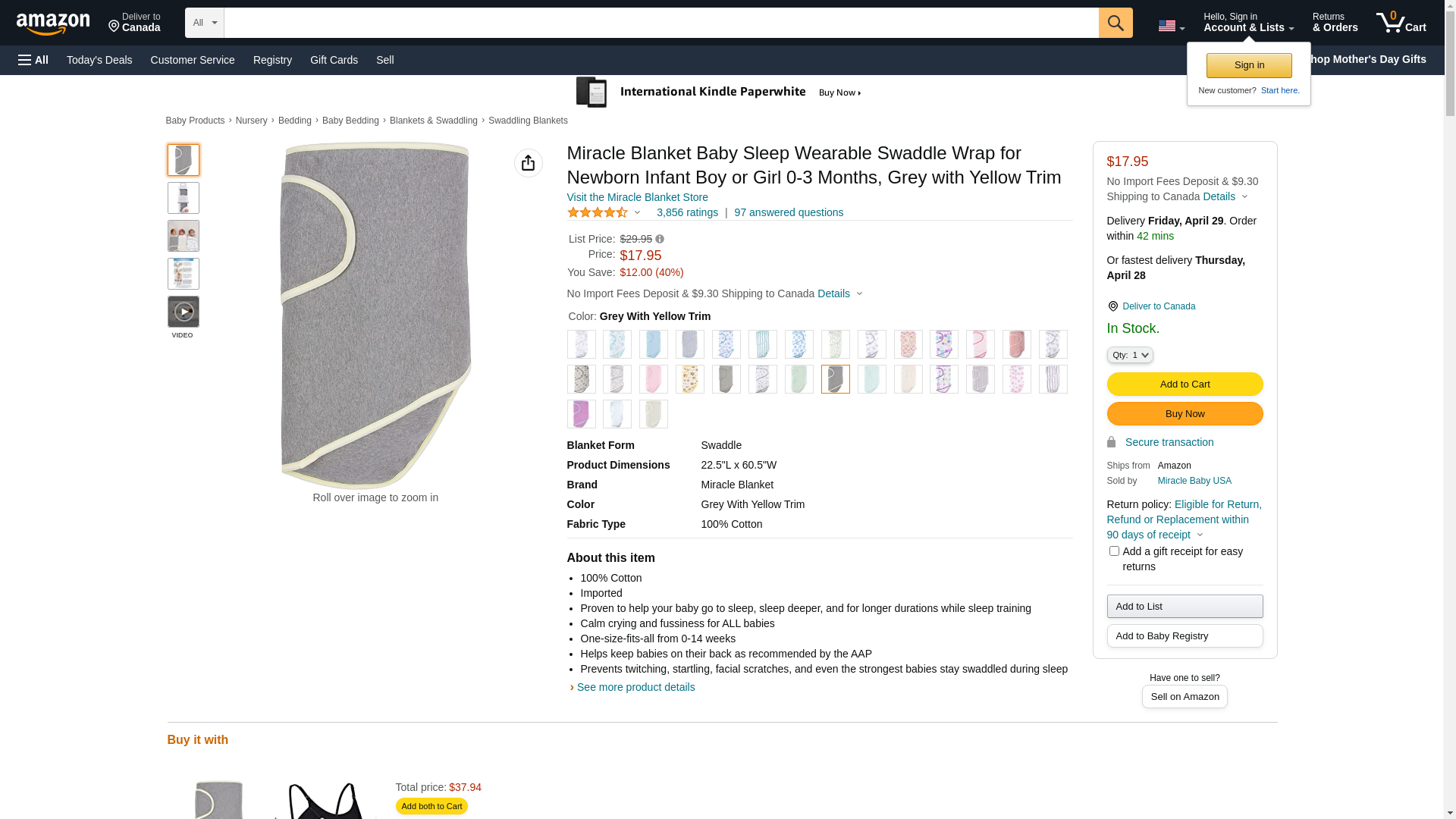 Miracle Blanket 46724 Gray With Yellow Trim Baby Swaddle Blanket