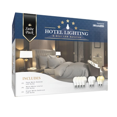 Includes 8 total LED bulbs: 2 deep warm, 4 warm white, 2 bright white. The Hotel Lighting 5-Star LED Solution Kit provides the ambience of home in any hotel room. Soft warm white lighting is easy on the eyes and promotes a cozy, comfortable atmosphere for winding down. Bright white LED lightbulbs work well in bathrooms where true colors and details are important for a daily routine. Each of these LED Lightbulbs are built like a flood light which softens the brightness emitted by the bulbs while filling the room. Build with an E26 Standard light base, Miracle LED bulbs can fit most any existing fixture. These high-quality affordable bulbs replace old, incandescent bulbs running at a fraction of the cost. Energy used: 12 Watts per bright white bulb, 9 Watts per warm white and deep warm bulbs