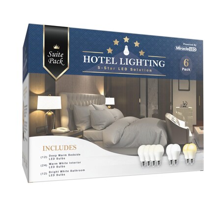 Includes 48 total LED bulbs: 12 deep warm, 24 warm white, 12 bright white. The Hotel Lighting 5-Star LED Solution Kit provides the ambience of home in any hotel room. Soft warm white lighting is easy on the eyes and promotes a cozy, comfortable atmosphere for winding down. Bright white LED lightbulbs work well in bathrooms where true colors and details are important for a daily routine. Each of these LED Lightbulbs are built like a flood light which softens the brightness emitted by the bulbs while filling the room. Build with an E26 Standard light base, Miracle LED bulbs can fit most any existing fixture. These high-quality affordable bulbs replace old, incandescent bulbs running at a fraction of the cost. Energy used: 12 Watts per bright white bulb, 9 Watts per warm white and deep warm bulbs