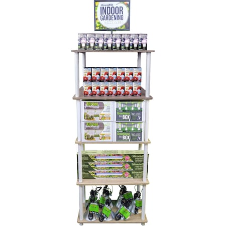 Start or expand your Indoor Gardening section today with our Best-Selling Absolute Daylight and Multi-Plant LED Grow Bulbs. From seed to flower, our Full Spectrum and Red+Blue Spectrum bulbs are optimized for the complete life cycle of plants. The included Kitchen Gardener and Greenhouse in a Box Kits make it easy to grow fresh herbs on your countertops or keep houseplants happy through those short winter days!INCLUDES:Red & Blue LED Grow Bulbs (50), Full Spectrum LED Grow Bulbs (75), Kitchen Gardener Kits (6), Greenhouse in a Box Kits (6), 2ft 25W Hangable LED Grow Lights (6), Clamp Fixtures (24), 5 Tier Shelf Display (1), Laminated Intro to Grow Lights POP sheets w/ziptie for hanging on shelving (1 Set), Indoor Gardening & Accesories Header Sign w/Frame Stand (1)Full Spectrum Absolute Daylight LED Grow bulbs emulate natural daylight to give your indoor plants the light they crave while blending in to any room of the house. Multi-Plant Red+Blue Spectrum Grow bulbs maximize plant growing potential for multiple plants by targeting the exact wavelengths of light that plants most benefit from. Our Multi-Plant Bulbs shine a wider beam of light to cover a greater area.From bulbs to lighting fixtures, this 5 tier shelf display has everything your customers need to start their own easy, indoor gardening set-up. Using Miracle LED technology, the included bulbs promote a hi-yield growing experience through all stages of a plants' life. WIth a growing market for indoor growing and up to 40% profit margins, its hard to pass up this deal.
