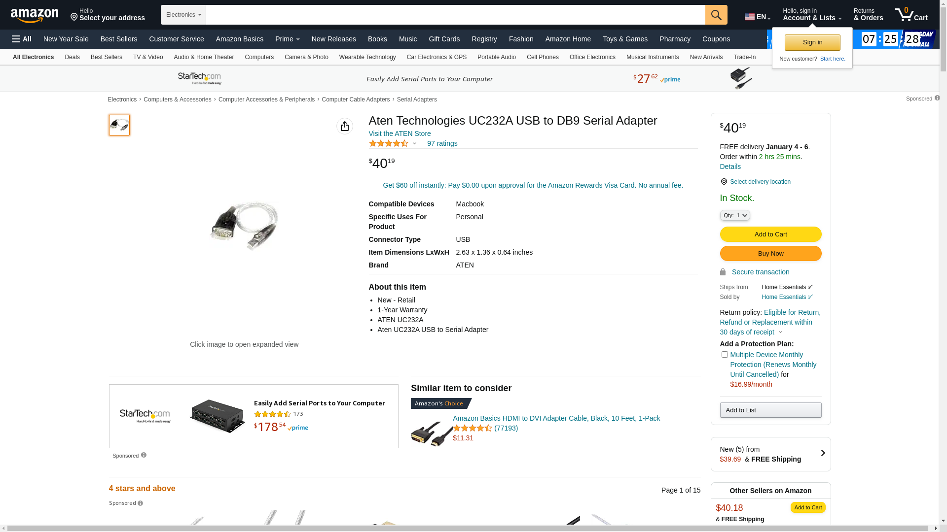 | Feature | Aten USB to RS-232 Converter - Type A Male USB, DB-9 Male Serial - 1.3ft |
