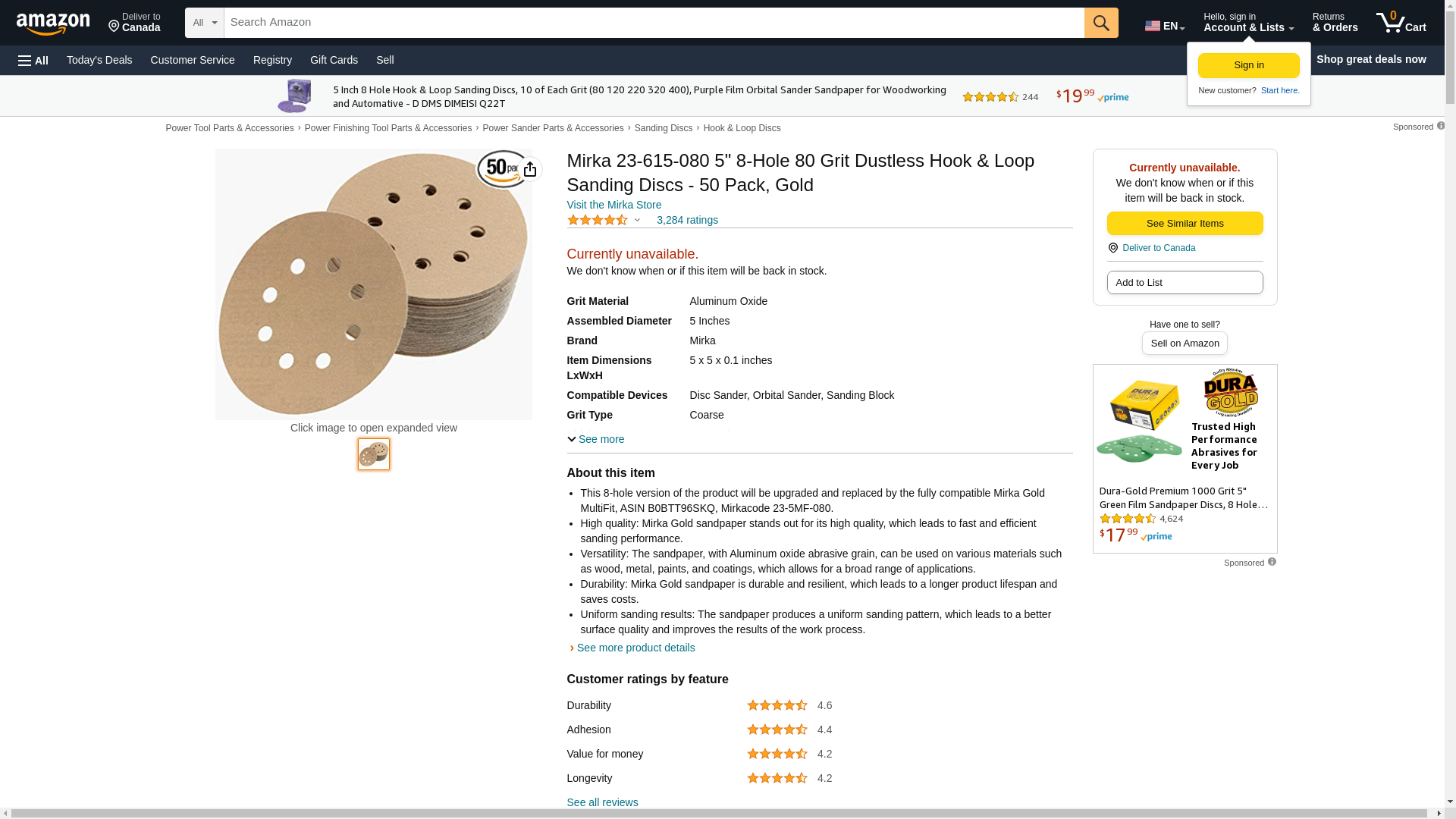10 Pack Mirka 23-615-080 5" Bulldog Gold 8-Hole 80 Grit Grip (Hook and Loop) Sanding Discs - 50 Discs per Box