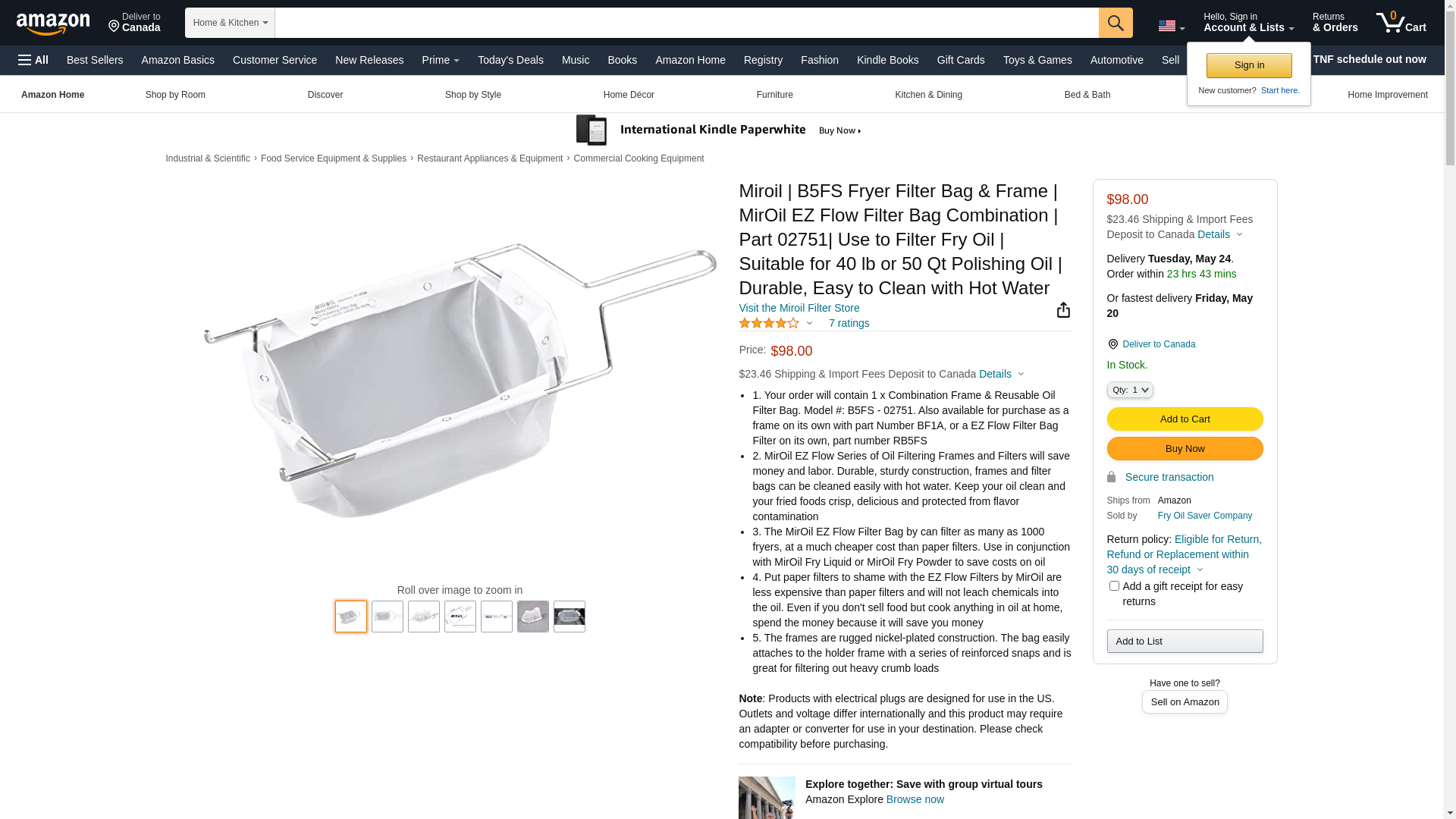 <p><strong>Miroil B5FS Combination Wire Frame Holder & EZ Flow MirOil Filter Bag, used for Deep Fryer Oil Filtration</strong></p><p>This MirOil Oil filter bag holder & bag is designed for filtering frying oil, and is recommended for use with MirOil Fry Liquid or FryPowder.</p><p>This EZ Flow Filter system by MirOil helps trap and catch food waste with incredible ease. The frame and filter combine to save on both labor and paper costs, as unlike comparable filters, this item does not require daily cleaning. After several uses however, the pair can be simply rinsed at the same time with a hot water spray prior to re-use</p><p>✔ Extra long handle and support hooks means that this oil filter frame holder sits securely on top of fryer oil filter pots, or other oil collection reservoirs<br>✔ Made of durable nickel-plated steel rods. It is sturdy and will last longer than you will<br>✔ Construction materials used makes it easy to clean<br>✔ This frame allows the filtering of hot oil whilst draining the fryer, or when refilling the fryer after cleaning. Can filter oil at both frying temps and safe, bath water temps<br>✔ Perfect for heavy crumbloads<br>✔ EZ Flow filters are less expensive than paper filters and will not leach chemicals into the oil<br>✔ Filter as many as 1000 fryers for half the cost of paper filters</p><p><i>Buy MIROIL</i></p><p><strong>Why should I filter my fryer oil?</strong><br>Regularly filtering your fryer oil saves money. It extends the life of your fryer oil, which in turn leads to less frequent refills.</p><p><strong>MirOil by Oil Process Systems Inc.</strong><br>Miroil fryer oil filtration accessories include a wide array of products intended to extend the life of your oil while maintaining the crisp and tasty flavor of chicken fingers, french fries, and other fried foods.</p><p>♥♥ <strong>Keep your oil clean and your fried foods crisp, delicious and protected from flavor contamination with the MirOil range of products. </strong>♥♥</p>
