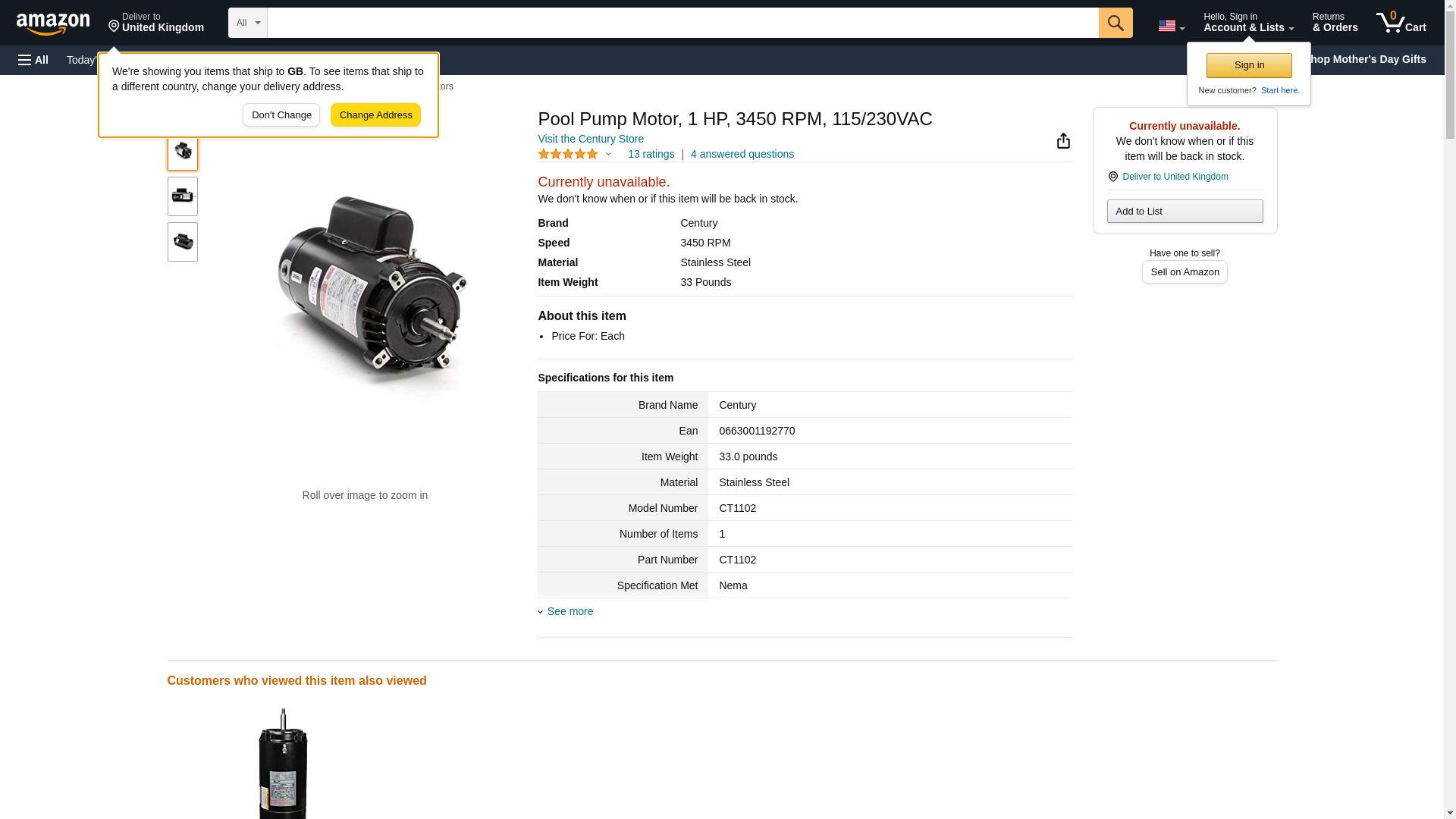 | Feature | Motor, Century,1.0hp,115v/230v,1-Spd,56Cfr,C-Face, Thd,EE |