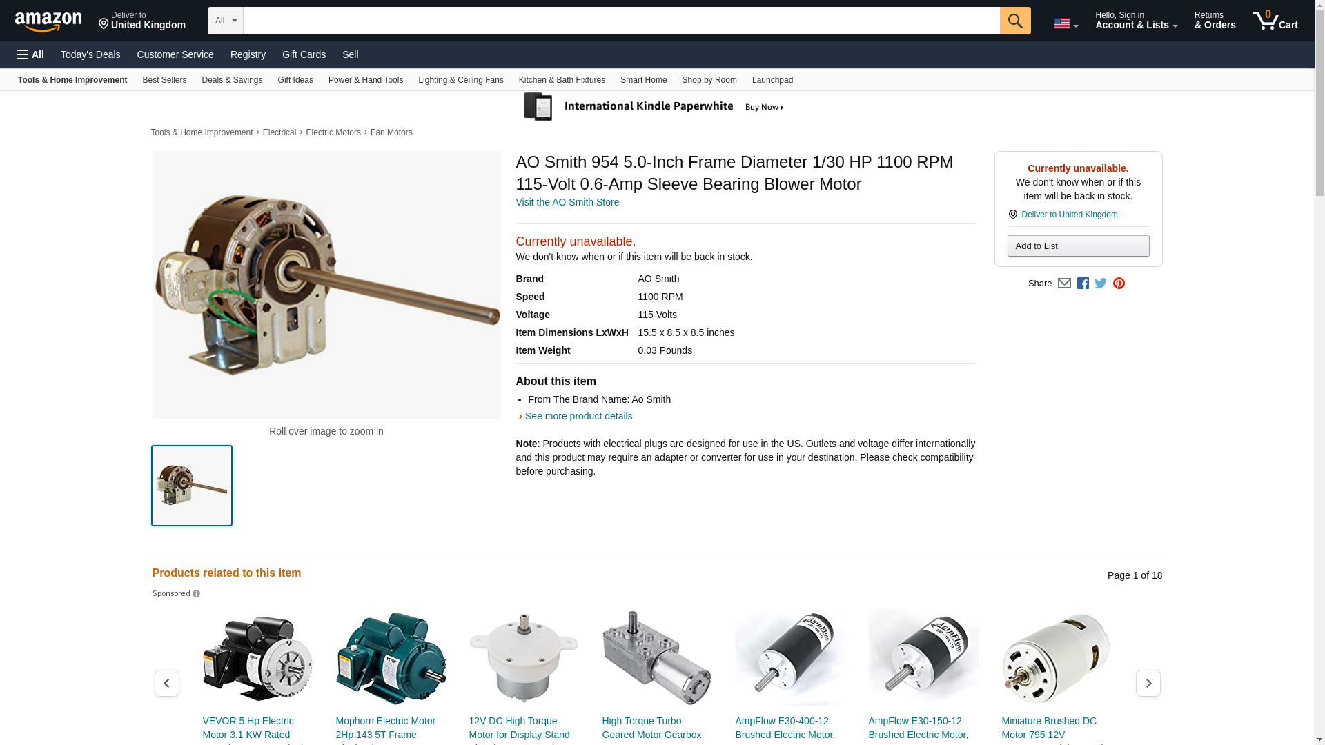 AO Smith 954 5.0-Inch Frame Diameter 1/30 HP 1100 RPM 115-Volt 0.6-Amp Sleeve Bearing Blower Motor