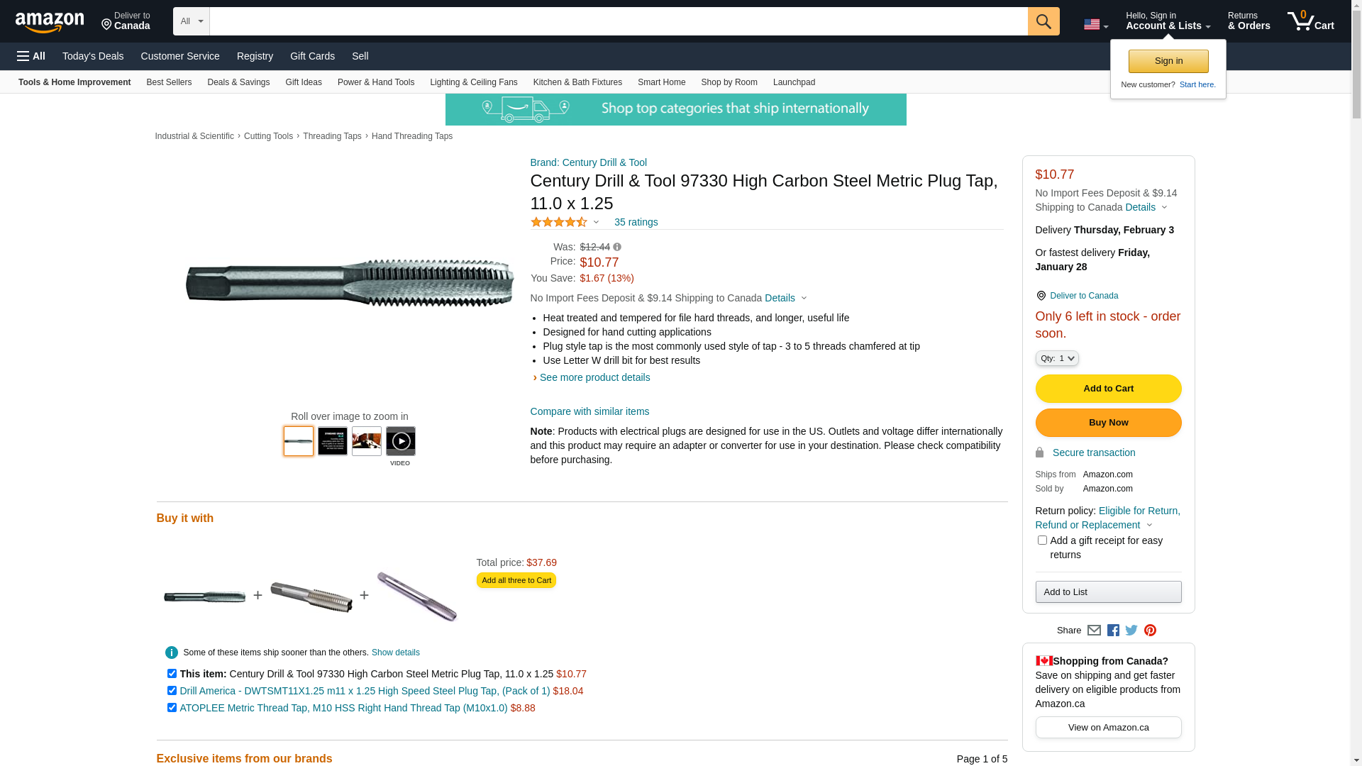 Century Drill & Tool 97330 Carbon Steel Metric Tap, 11.0X1.25