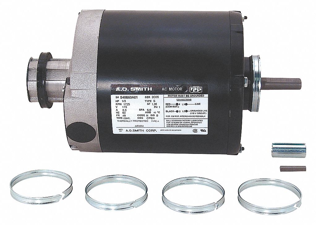 Split Phase Adjustable Ring Mount MotorQuick-FitAuto ProtectionOpen DripproofReversible1/2 Shaft, sleeve, and key adapter to 5/8 shaft1/2 HP1725 RPM115 Volt8 Full Load Amps48 FrameSleeve Bearing