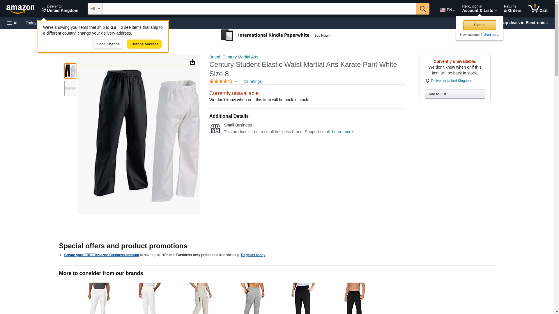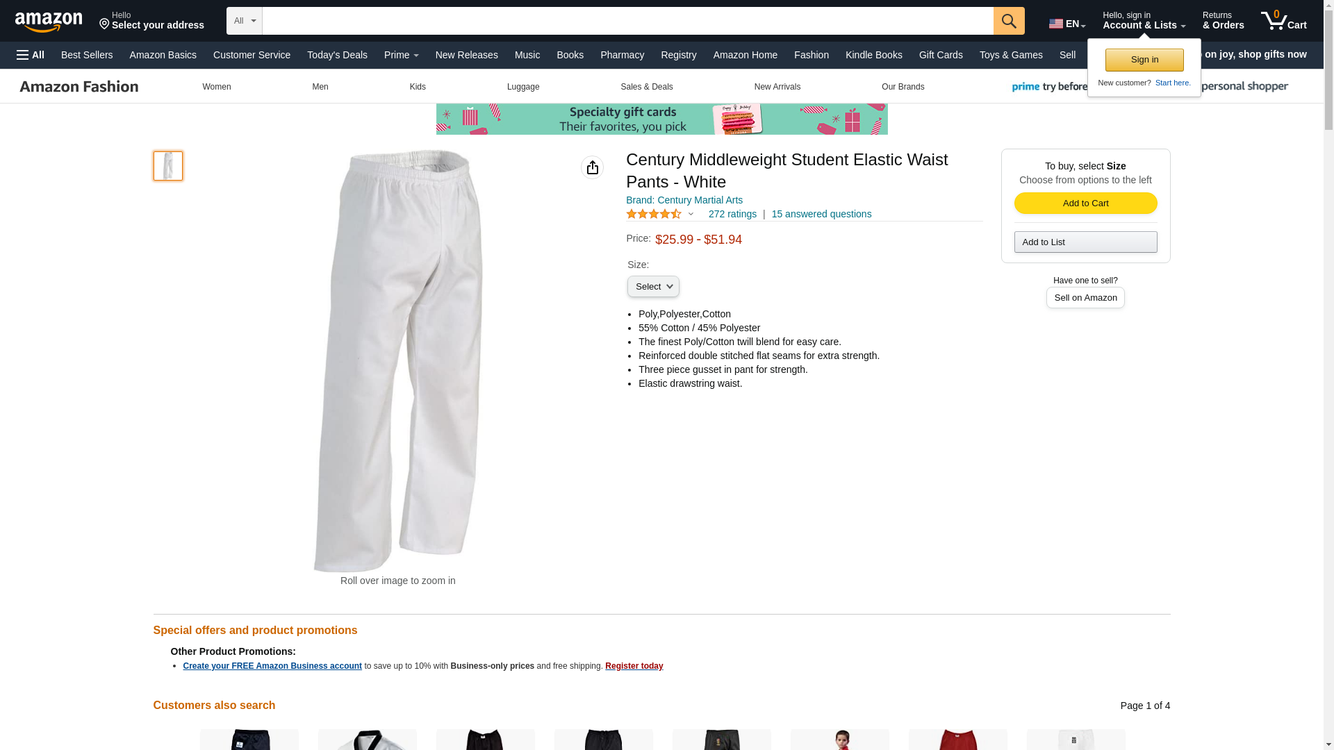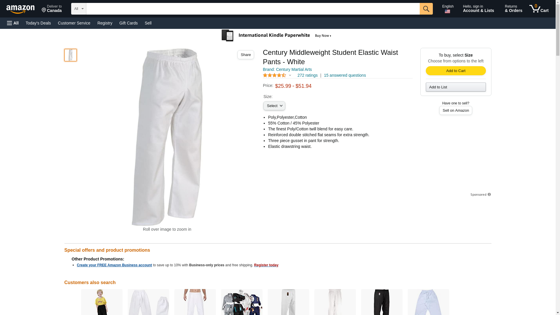 Century Student Elastic Waist Martial Arts Karate Pant White size 1